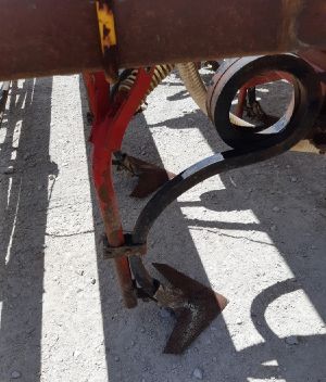 L’agriculteur a réélargi son chisel de 4 mètres pour un meilleur débit de chantier. Pour avoir un meilleur dégagement, une poutre a été ajouté à l’arrière du chisel qui comprend actuellement 29 dents réparties sur 4 rangées. Il a monté dessus une colonne de distribution et des descentes derrière chaque dent. 4 roues de jauges ont été montées (2 à l’avant et 2 à l’arrière) pour un meilleur contrôle de la profondeur de semis. Le semoir comprend aujourd’hui 29 dents queue de cochon de 40mm, équipées chacune d’un soc fin de type « AFC ». L’écartement de semis est donc de 17cm. Le recouverement de la graine est assuré par des chainettes situées derrière chacune des dents. La trémie frontale, servant également au strip-till, permet de mieux répartir les masses et de charger plus de semences (1500L) que si elle était placée sur le semoir.