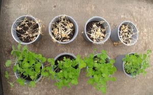 Des tests ont ensuite été réalisés en serres, et ont montré que le produit avec des coformulants biologiques était très efficace contre les dicotylédones et un peu moins contre les monocotylédones.