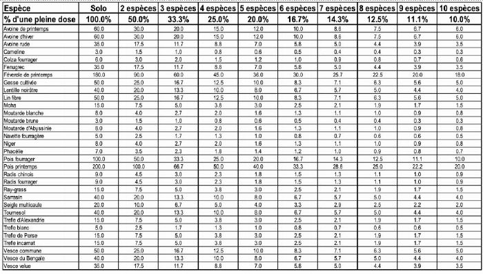 Au-dessus de 5 espèces la quantité de biomasse produite n'augmente plus, plus on augmente le nombre d'espèces et plus chaque espèce va être semée à une faible quantité. Ainsi si on met 10 espèces, on est sûr d'avoir des levées, mais les espèces qui vont sortir vont être trop faiblement dosées.