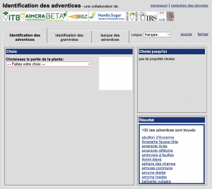 Enfin, le dernier onglet "Lexique des adventices" permet de sélectionner une espèce par son nom ou son code et d'en obtenir le nom latin, espagnol, italien, allemand, anglais, suédois ou encore polonais.