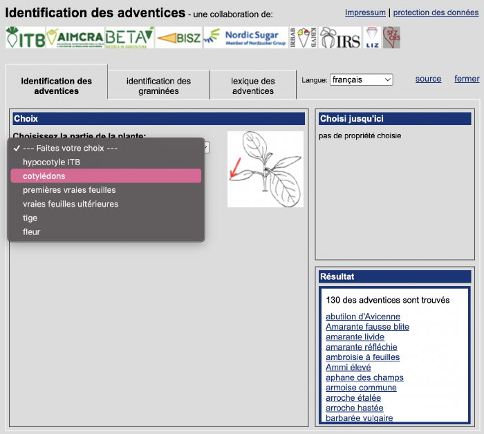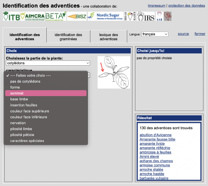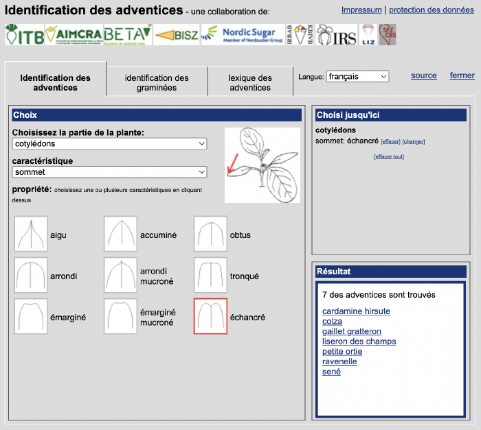 L’outil repose sur une méthode visuelle : l’agriculteur sélectionne la partie de la plante observée (cotylédon, feuille, tige, fleur) et choisit des caractéristiques visuelles (forme, pilosité, couleur, taille). À partir de ces critères, il obtient une liste d’adventices possibles avec leurs fiches associées.
