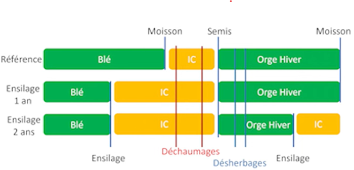Ici l’impact est considéré sur 2 ans avec une rotation témoin non ensilée. Une modalité avec un seul ensilage la première année. Puis un ensilage chaque année. Les intercultures (IC) sont gérées de manière similaire avec deux déchaumages.