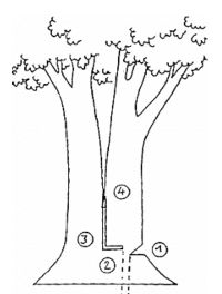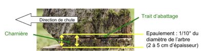 - Séparer le jumelage par une coupe verticale en prenant soin de conserver dans la partie supérieure une attache suffisante au maintien de l’arbre en cours d’abattage