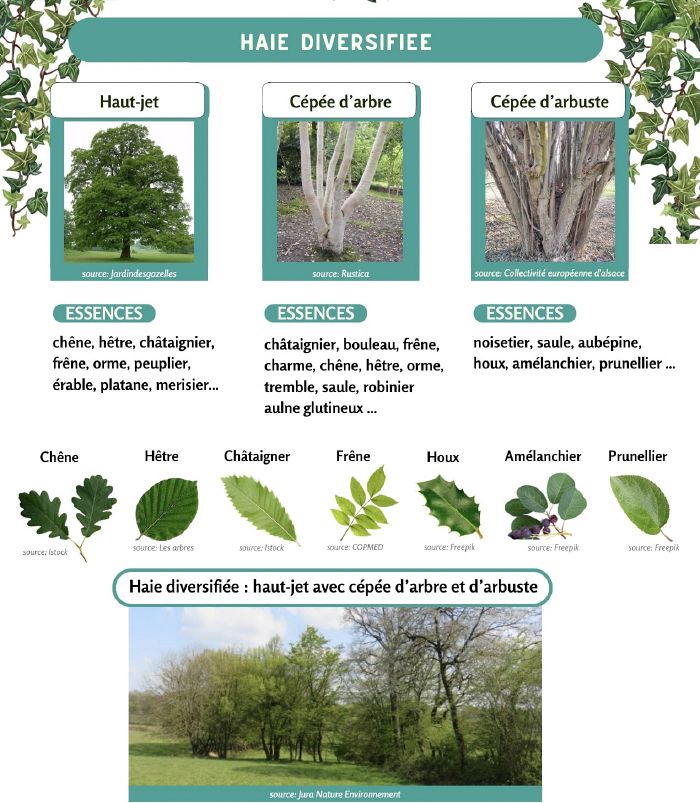 - Essences : noisetier frêne saule cornouiller sanguin châtaigner tilleul érable chêne hêtre charme aubépine prunellier