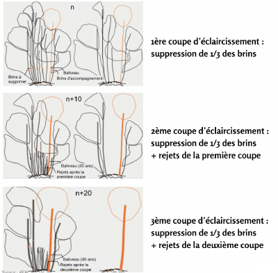 → Ne couper que les brins les plus gros et garder les plus jeunes pour assurer le relais de la production de bois