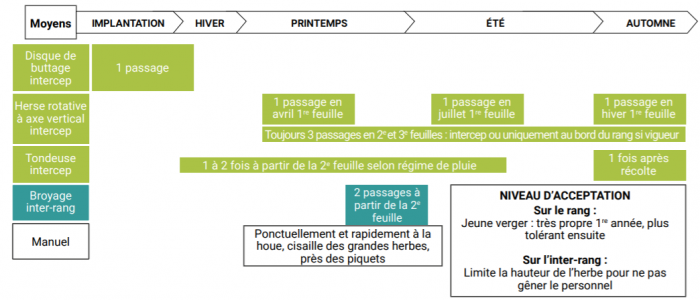 • Les jeunes vergers (PFI ou AB) vont nécessiter un soin particulier avec un certain nombre d’interventions mécaniques pour la gestion de l’enherbement sur le rang