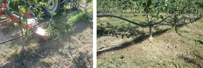 - Les jeunes vergers (PFI ou AB) vont nécessiter un soin particulier avec un certain nombre d’interventions mécaniques pour la gestion de l’enherbement sur le rang