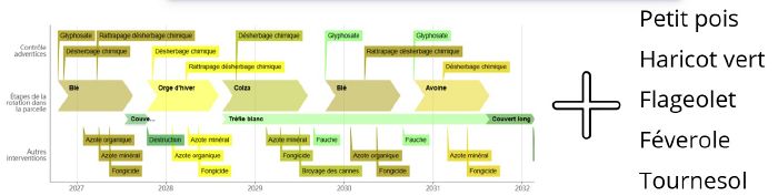 Sur les différentes parcelles, la majorité de la rotation est la même, seule la dernière culture change, elle peut être : du petit pois, du flageolet, du haricot vert, de la féverole ou du tournesol. Les cinq cultures se font chaque année mais sur des sols différents.