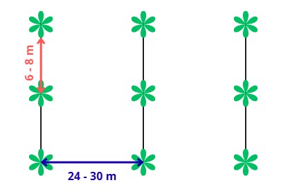 Les lignes d’arbres sont disposées tous les 24-30 m, et 6-8 m séparent les arbres entre eux sur une même ligne (40-50 arbres à l’hectare).