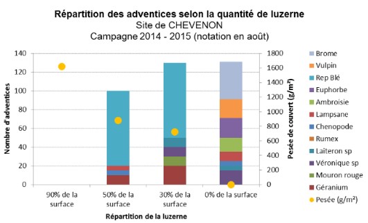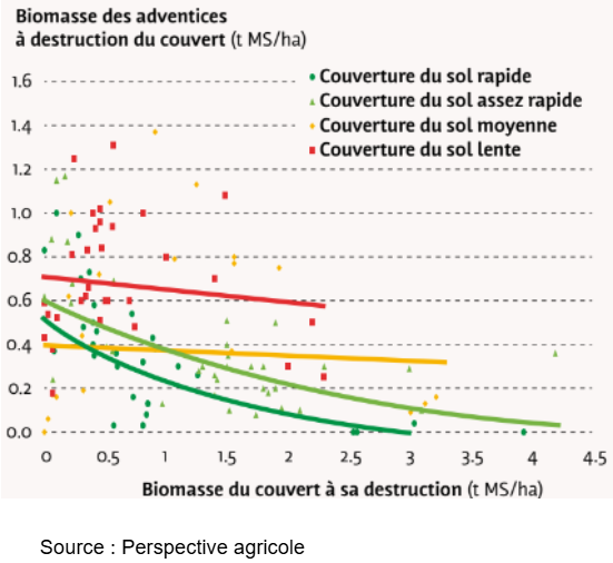 Cependant, moins le couvert est compétitif, plus la diversité des espèces adventices est importante. Il n'y a donc pas forcément d’impact quantitatif sur les adventices lorsque l’on est en dessous de 50% de surface occupée par le couvert, mais il y a une modification qualitative.