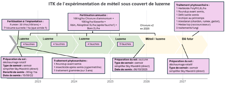 L’objectif global est de maintenir un couvert fonctionnel jusqu’à sa destruction en septembre/octobre 2026 tout en produisant un maximum de biomasse. Il est déconseillé d’associer seulement de la luzerne avec de l’avoine, car cela retarderait la première coupe de luzerne jusqu’au mois de septembre. Il pourra obtenir seulement deux à trois coupes dans l’année en raison de la concurrence.