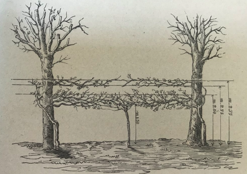 - Association vigne-arbre (forme traditionnelle "vite maritata") : un arbre sert de support à une ou plusieurs vignes. L’arbre peut être implanté tous les 5 à 8 m, parfois tous les 2 à 3 ceps. Des distances minimales entre les arbres et les ceps (3-4 m) restent recommandées pour limiter la concurrence.[6][11]