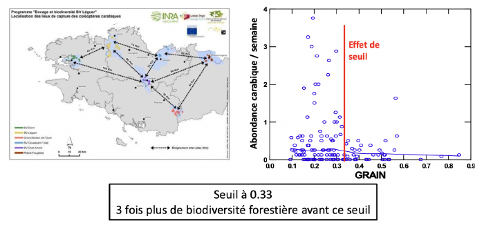 Un effet de seuil a été observé : la présence d’espèces forestières devient significative lorsque le grain bocager est inférieur à 0,33, mais cela n’est efficace que si la qualité des haies est également bonne.