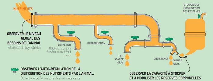 Les différentes périodes de demande alimentaire de chacun des types d’animaux déterminent les préoccupations à avoir en matière de végétation disponible au pâturage. Elles varient en fonction des besoins physiologiques que l’éleveur cherche à couvrir, en lien avec le calendrier de reproduction et de production. La façon dont les animaux assument un décalage entre besoins et offre nutritionnelle est également à prendre en compte. Ce décalage se fait en alternant mobilisation et stockage des réserves corporelles et gestion de la distribution des nutriments pour les différentes fonctions à assurer (entretien, reproduction, production). La demande alimentaire peut être vue comme une tuyauterie sur laquelle est greffée un ensemble de robinets représentant les différentes fonctions à couvrir par les animaux. Les robinets sont le moyen de réguler les flux d'allocation des nutriments. Un vase d'expansion permet de gérer les réserves corporelles.
