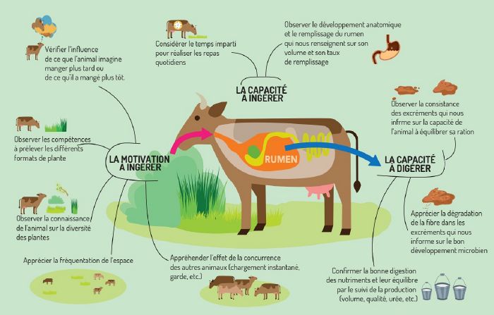 Le ruminant dispose d'aptitudes anatomiques pour ingérer et digérer (forme de la bouche, estomacs supplémentaires, rumen volumineux, rumination). Il dispose aussi d'aptitudes métaboliques pour réussir à s’alimenter sur des fourrages fibreux (fermentation microbienne, absorption des nutriments, stockage de réserves). Il dispose enfin d'aptitudes cognitives pour renforcer les comportements efficaces et limiter les erreurs alimentaires (connaissance des aliments, compétences de préhension, gestion du temps, préférences alimentaires). Ces trois aptitudes peuvent être caractériser au travers d'un regard porté sur les différentes capacités des animaux à ingérer et à digérer. Ces capacités sont influencées par une multitude de paramètres et sont donc construites, au fil de sa vie et en temps réel, par l’environnement d’élevage et par la conduite de l’éleveur. Il s’agit de bien les connaître pour savoir si ses animaux seront capables de satisfaire leurs besoins à partir de fourrages disponibles dans les parcelles de la ferme.