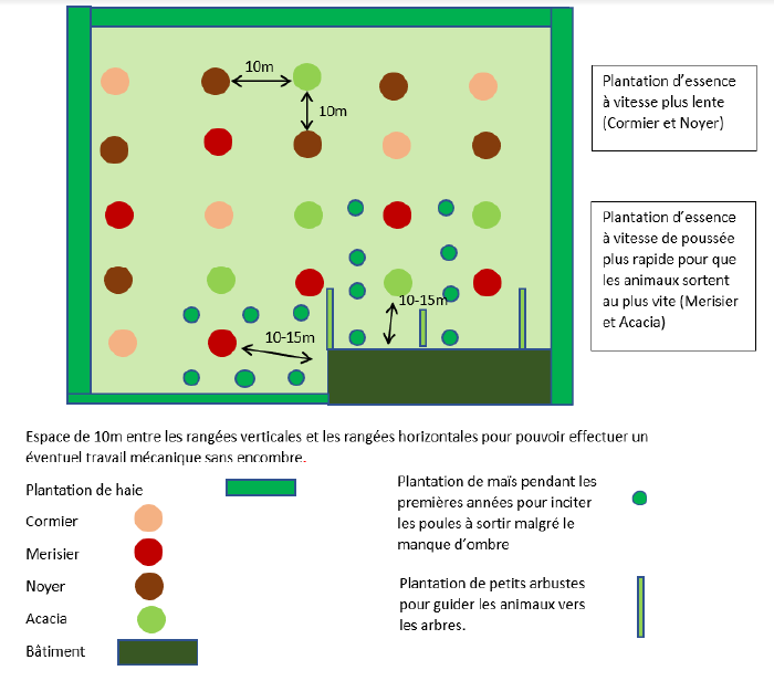 - Le parcours avec aménagements agroforestiers possède les mêmes caractéristiques que le parcours bocager. Cependant, on ajoute des rangées d’arbres supplémentaires, en fond de parcours, permettant à l’agriculteur de générer un revenu additionnel (bois d’œuvre, bois de chauffage, fruits,...). Cet aménagement ne permet pas une exploration plus importante du parcours par les volailles car trop distant du bâtiment. En effet, seulement 5% du cheptel s’aventure au fond du parcours.