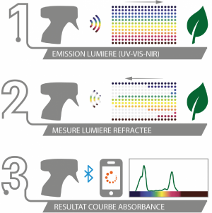 - Réception de la lumière réfractée : Lorsque la lumière interagit avec les tissus végétaux, certaines longueurs d’onde sont absorbées, tandis que d’autres sont réfléchies. Le capteur optique du Nutriscope capture l’intensité des signaux lumineux renvoyés pour chaque longueur d’onde.