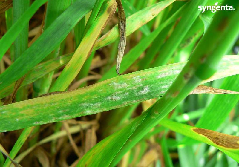 La présence d’oïdium sur la base de la tige n’est pas préjudiciable à la culture. Le champignon se déploie à partir des feuilles pour toucher ensuite l’épi, où il réduit le rendement.