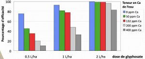 Efficacité du glyphosate sans adjuvant sur blé en fonction de la dureté de l'eau et de la dose de produit appliquée à T+28 jours (source : Arvalis, 2013)