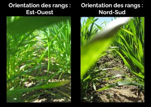 Catherine Boger, en Australie, a observé une réduction de la biomasse adventices de 51 % dans une culture de blé et de 37% dans l’orge avec une orientation est-ouest des rangs par rapport à une orientation nord-sud.