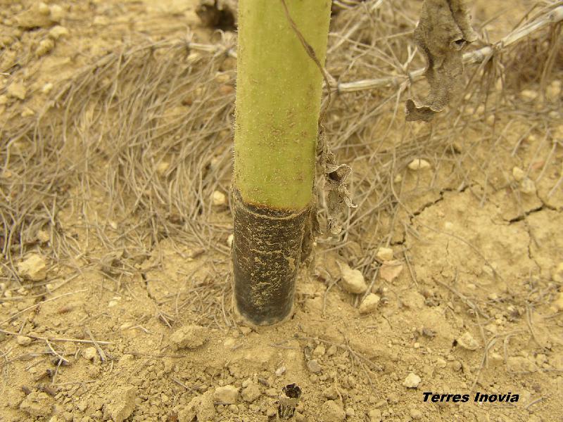 Facteur aggravant du stress hydrique après floraison. En cas d’attaque au collet, arroser si possible. Ne pas confondre avec Macrophomina qui entraîne aussi un dessèchement précoce des pieds. Reconnaissable, car il détruit la moelle en bas de tige.