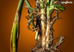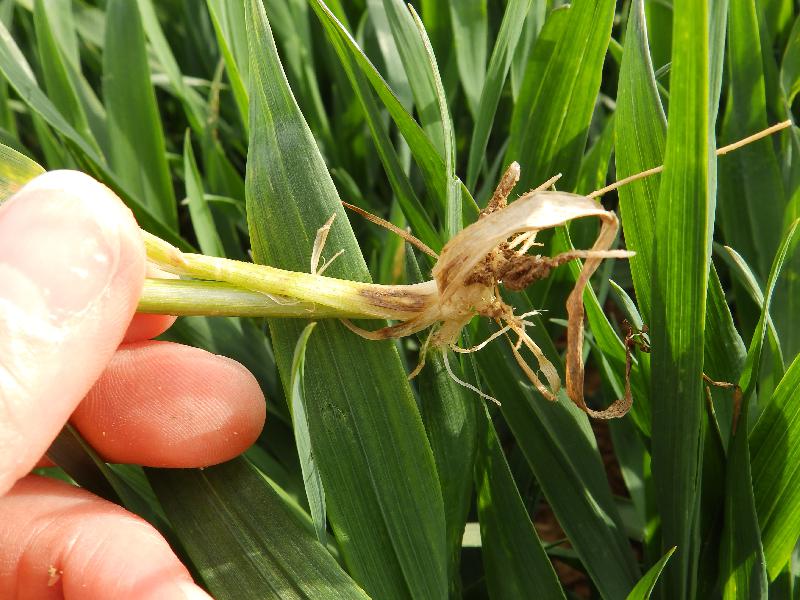 Tige : une seule tache (rarement deux), peu délimitée et diffuse, souvent sous le premier nœud. Verse possible à maturité en cas de forte attaque.