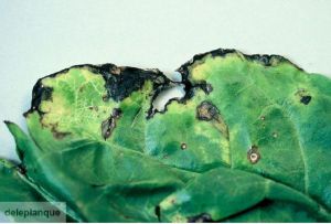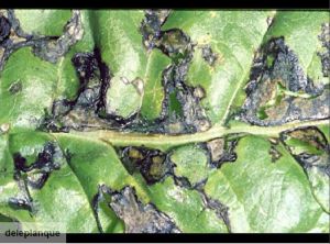 Taches noirâtres : nécroses de formes et de tailles irrégulières.