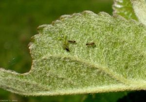 Le puceron vert se nourrit de la sève des feuilles. Il forment des colonies qui vont provoquer le recroquevillement des feuilles et donc une perte d’activité photosynthétique. Une infestation importante gêne la croissance des pousses. Les pucerons verts sécrètent un miellat qui favorise l’installation de fumagine qui impactent l’esthétisme des fruits.