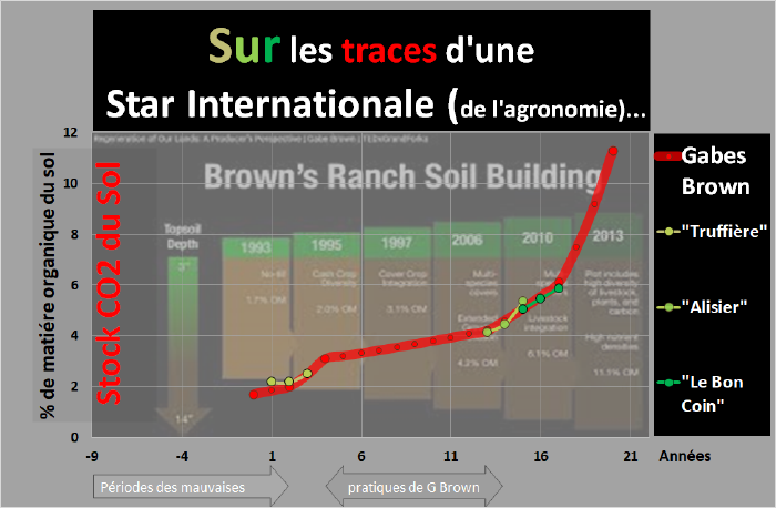Du point de vu de l'expérimentation, et de la preuve de la transposabilité du procédé de Gabe Brown sur des sols Européens, il est important de noter que la réplication est triple. En plus les cinétiques d'évolution son parfaitement comparables à ce qu'à pu observer l'américain. Les résultats sont comparables, puisque les analyses sont effectuées par le même protocole. Voici une image composite présentant une courbe d'évolution en teneur en matière organique des sols de Gabe Brown construit à partir du barre graph qu'il communique et la superposition des variations observée aux Peyrounels: