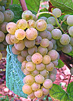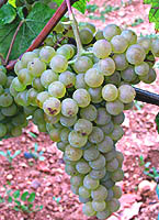 Grappes moyennes à grandes, cylindriques, compactes, ailées; baies petites à moyennes de grosseur irrégulière, sphériques ou légèrement aplaties, blanches devenant rosées à complète maturité, peu juteuses.