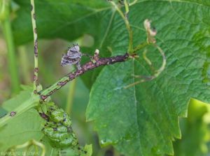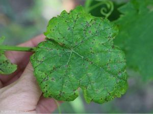 Sur feuilles : taches jaunes entourées de bande claire sur cépage blanc, ou bande violacé sur cépage rouge. Dessèchement partiel ou total du limbe et chute des feuilles.