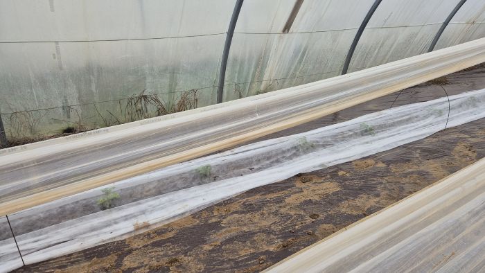 - Sous tunnels, les melons sont greffés sur des porte-greffes de courge pour bénéficier de la vigueur de la courge, qui démarre plus rapidement qu’un pied de melon. En effet, le melon étant plus sensible au froid du sol, la courge permet une meilleure croissance initiale. De plus, la courge est plus résistante aux maladies spécifiques du melon. Une bâche noire est également mise pour gérer les adventices et accumuler de la chaleur dans le sol pour que les melons se développent rapidement (aux alentours de 16°C, c’est l’idéal).