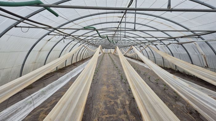 - Pour éviter que l’humidité et la chaleur excessive ne perturbent la pollinisation, ils pratiquent le semi-débâchage lorsque les températures commencent à augmenter. Cela consiste à retirer le boudin de terre qui maintient la bâche au sol permettant ainsi la fuite de l’air chaud et favorisant la ventilation. Si l’environnement devient trop confiné et humide, les abeilles ne peuvent pas polliniser efficacement ce qui entraîne une coulure au niveau des fleurs et des fruits. Lorsque les températures atteignent des niveaux trop élevés, ils retirent également la chenille.