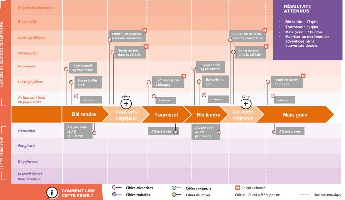 - Cultures remarquables : Cultures de printemps (maïs et tournesol), précédées d’un couvert implanté avant la récolte du blé précédent