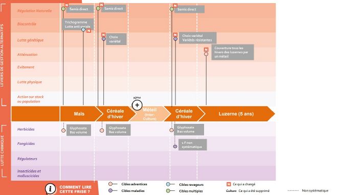 L’allongement de la rotation avec des prairies longues durées, la luzerne, les couverts d’interculture ont un effet nettoyant sur la parcelle avec les fauches successives. Les risques de maladies ont été diminués avec le choix de variétés plus résistantes.