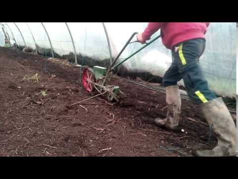 Semis sur une couche de broyat de déchets verts en place depuis 1 ou 2 ans. Semoir Sembdner. On utilise aussi un Planet.