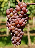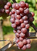 Grappes petites à moyennes, cylindro-coniques, courtes, compactes, pédoncules moyens forts restant verts; baies petites à moyennes, ovoïdes ou légèrement ellipsoïdes, roses devenant rouges à maturité complète, chair fondante juteuse à saveur un peu aromatique. Rameaux herbacés de couleur rouge foncé et vrilles assez grandes. Point pétiolaire, nervures et pétioles des feuilles sont de couleur rouge vineux.